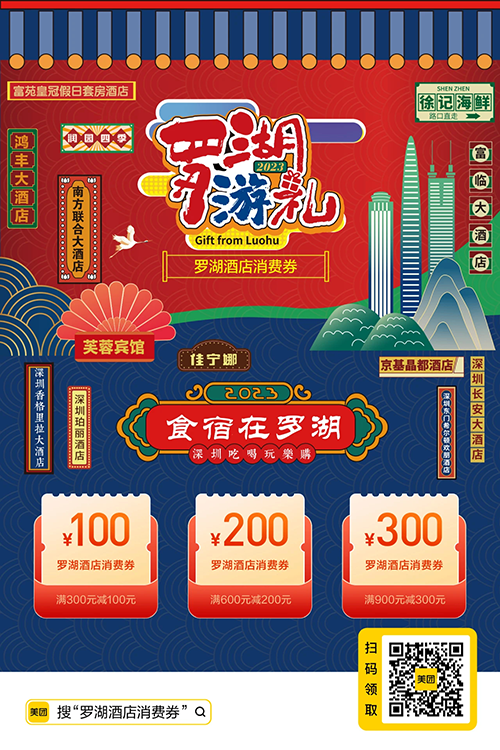 一重礼遇:“筑巢引凤礼”。从2023年12月21日至2024年1月10日,您可以通过美团App领取罗湖区酒店优惠券。无论您选择豪华舒适的五星级酒店还是精致个性的品质酒店,都可以享受满300减100、满600减200、满900减300的优惠。